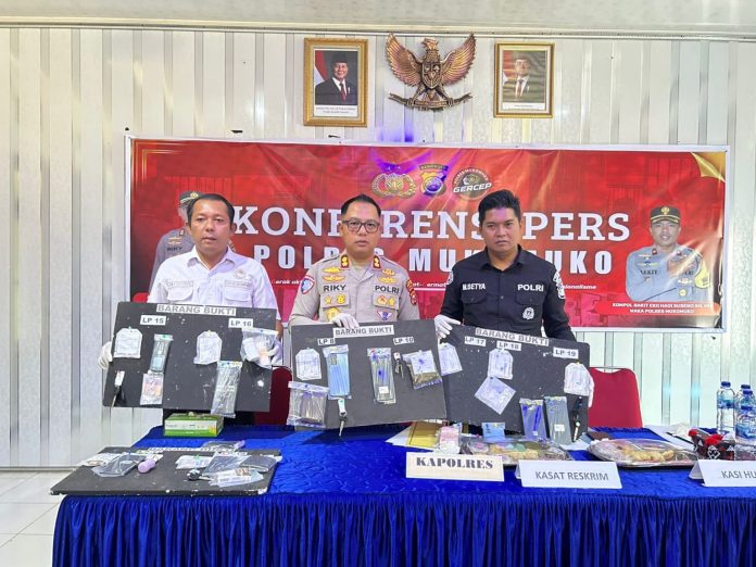 Kapolres Mukomuko AKBP Riky Crisma Wardana SIK yang didampingi Kasat Reskrim IPTU Novaldy Dewanda Baskara S.tr.K, dan Kasat Narkoba AKP SMO Aritonang serta Kasi Humas IPTU M Setya YM disaat menggelar Konferensi Pers di Aula Mapolres Mukomuko, Kamis (10/7/25). (Foto Dok. FaktaNews24.com)