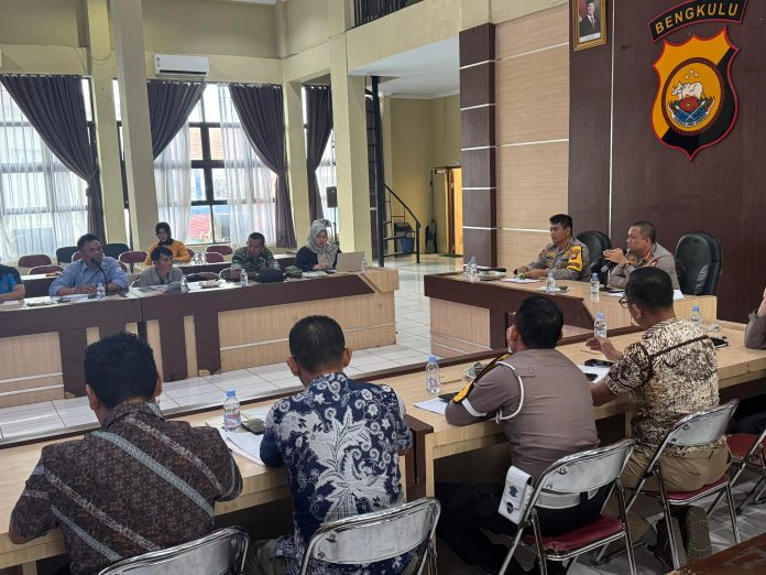Polda Bengkulu menggelar rapat koordinasi pengamanan menyambut gelaran BKLSPEED.COM Drag Bike Championship 2025 di Aula Coment Center Mapolda Bengkulu, Jumat (25/7). (Foto: Restu Edi/Spoiler.id)