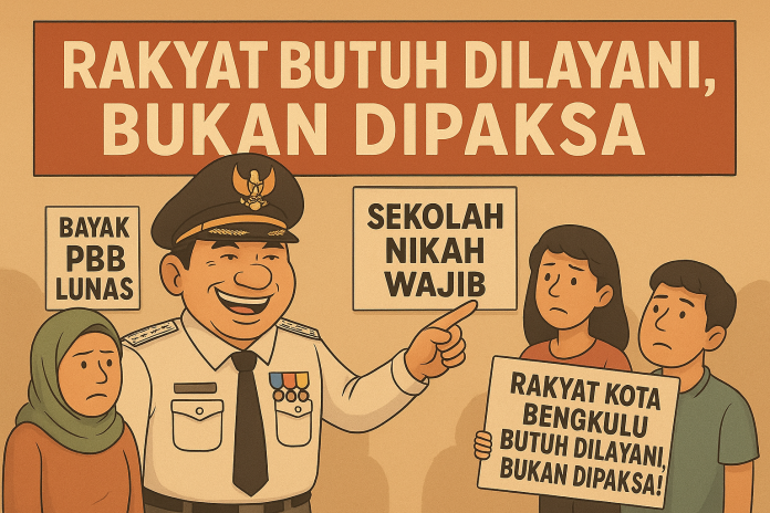 Di sisi lain, Pemkot Bengkulu juga mewajibkan warganya melunasi Pajak Bumi dan Bangunan (PBB) sebagai syarat untuk mengurus layanan tertentu. Kedua kebijakan ini tampak berbeda—satu menyentuh soal rumah tangga, satu lagi soal fiskal—tetapi benang merahnya sama: negara masuk terlalu jauh ke ruang privat warganya.