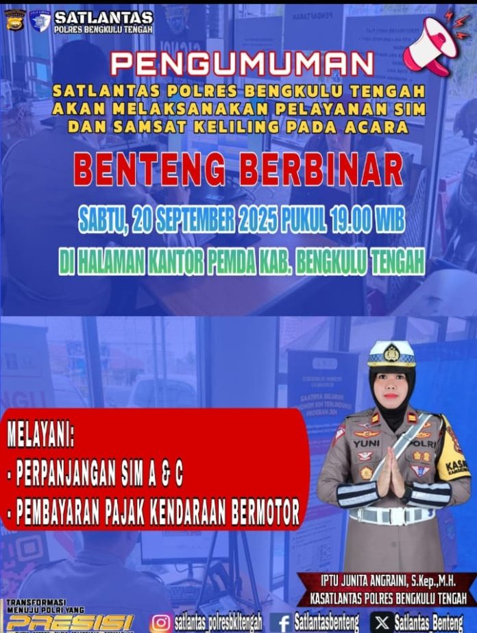 “Melalui kegiatan Benteng Berbinar, kami ingin mendekatkan pelayanan kepolisian, khususnya perpanjangan SIM dan pembayaran pajak kendaraan bermotor, agar masyarakat lebih mudah dan tidak perlu jauh-jauh datang ke kantor Satpas atau Samsat,” ujar IPTU Junita di Bengkulu Tengah, Sabtu.
