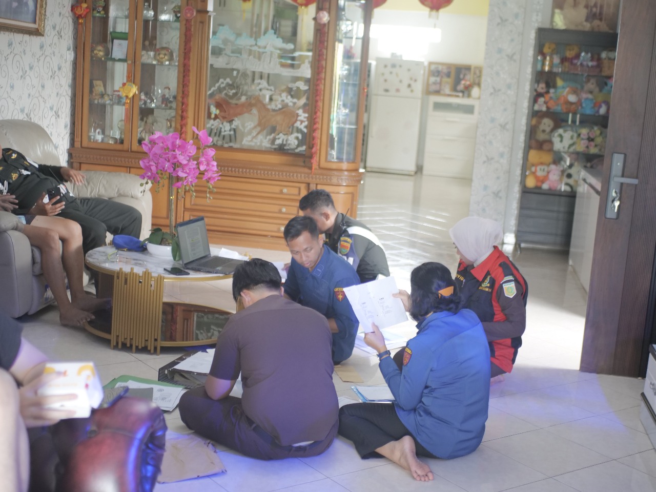 Tim penyidik datang berpakaian lengkap dengan menggunakan rompi hitam bergaris merah bersama anggota TNI Bengkulu.