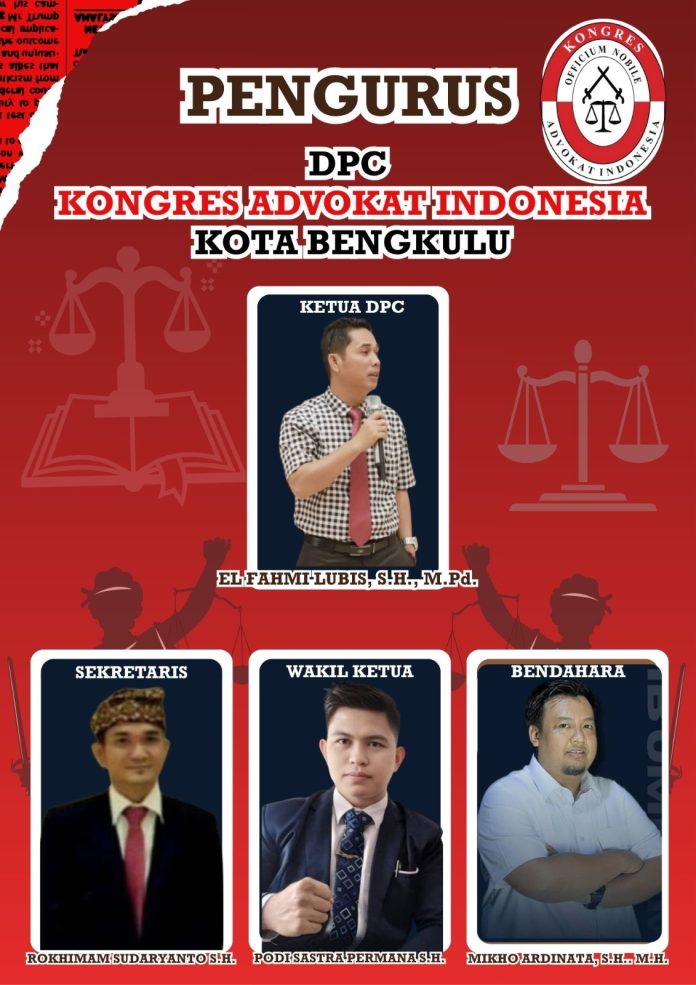 Bengkulu, Spoiler.id – DPC Kongres Advokat Indonesia (KAI) Kota Bengkulu dan Bengkulu Tengah, kini telah memiliki nakhoda baru. Ditunjuk sebagai Ketua DPC adalah Advokat Elfahmi Lubis, S.H., M.Pd., C.Med., C.PArbiter. Sementara itu sebagai Wakil Ketua Advokat Pody Sastra Permana, S.H., CLD, Sekretaris Advokat Rokhimam Sudaryanto, S.H, dan Bendahara Advokat Mikho Adinata, S.H., M.H.