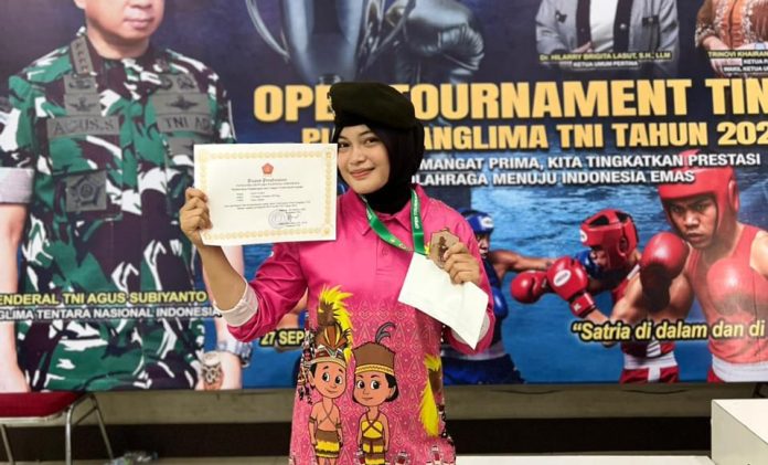 Bengkulu, Spoiler.id – Personel Polwan Ditsamapta Polda Bengkulu atas nama Bripda Jenitiara, meraih Juara 3 dikelas Women’s Feather W57kg pada kejuaraan Open Tournament Tinju Piala Panglima TNI Dalam rangka Peringatan HUT ke-80 TNI Tahun 2025, yang diselenggarakan mulai tanggal 28 September – 02 Oktober 2025 di di Balai Prajurit Makodam I/Bukit Barisan, Medan, Sumatera Utara