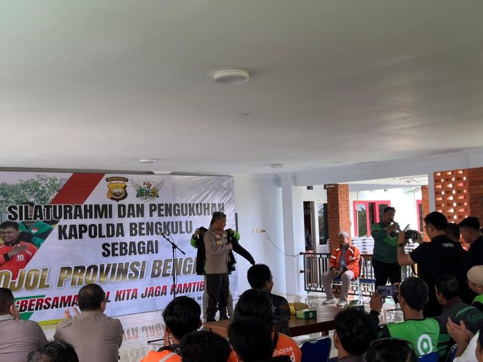 Bengkulu, Spoiler.id – Kapolda Bengkulu Irjen Pol Mardiyono S.Ik., M.Si resmi dikukuhkan sebagai Bapak Ojol Bengkulu dalam kegiatan silaturahmi yang berlangsung di Lapangan Golf Jalan Citandui, Kelurahan Lingkar Barat, Kecamatan Gading Cempaka, Kota Bengkulu, Jumat (14/11) pukul 14.00 WIB. Acara ini dihadiri sekitar 200 pengemudi ojek online dari berbagai platform, seperti Grab, Maxim, Gojek, dan Shopee.