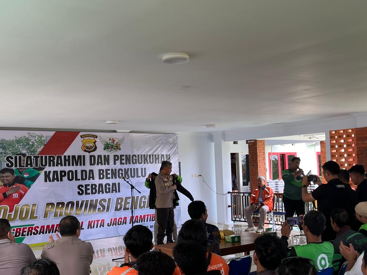 Pengukuhan dilakukan melalui prosesi penyematan jaket kehormatan Bapak Ojol Bengkulu kepada Kapolda yang disaksikan para pengemudi. Dalam kesempatan itu Kapolda Bengkulu menyampaikan apresiasi atas kepercayaan yang diberikan kepadanya.