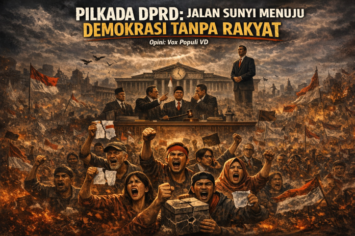 Spoiler.id – Wacana mengembalikan pemilihan kepala daerah kepada DPRD terdengar seperti solusi. Tetapi dalam sejarah demokrasi, “solusi” semacam ini sering kali menjadi awal masalah yang lebih besar. Bahasa yang dipakai rapi: efisiensi, stabilitas, penghematan anggaran, meredam konflik. Namun di balik seluruh istilah teknokratis itu, tersembunyi satu fakta politik yang telanjang: kekuasaan sedang ditarik menjauh dari rakyat.