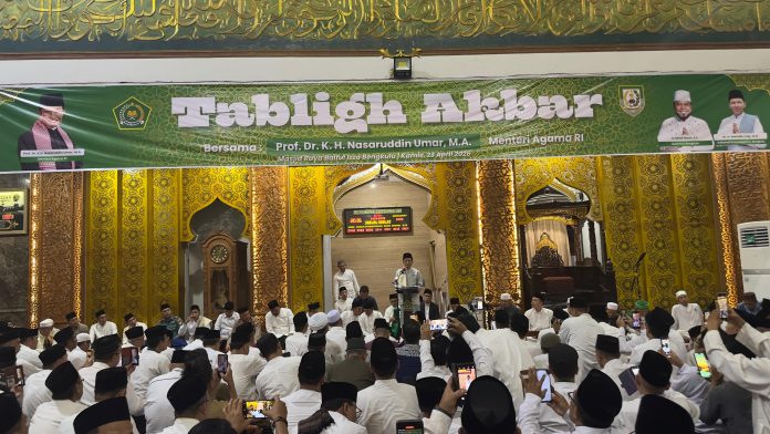 Bengkulu, Spoiler.id – Menteri Agama RI Nasaruddin Umar menghadiri kegiatan tabligh akbar yang digelar di Masjid Raya Baitul Izzah, Kamis (23/4/2026) malam.