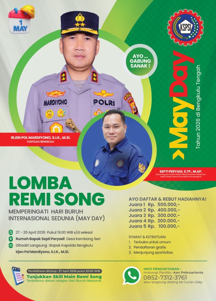 Bengkulu, Spoiler.id – Peringatan Hari Buruh Internasional (May Day) 2026 di Bengkulu Tengah akan diramaikan dengan kegiatan lomba Remi Song yang digelar di Desa Kembang Seri. Kegiatan ini menjadi salah satu ajang silaturahmi sekaligus hiburan bagi masyarakat umum.