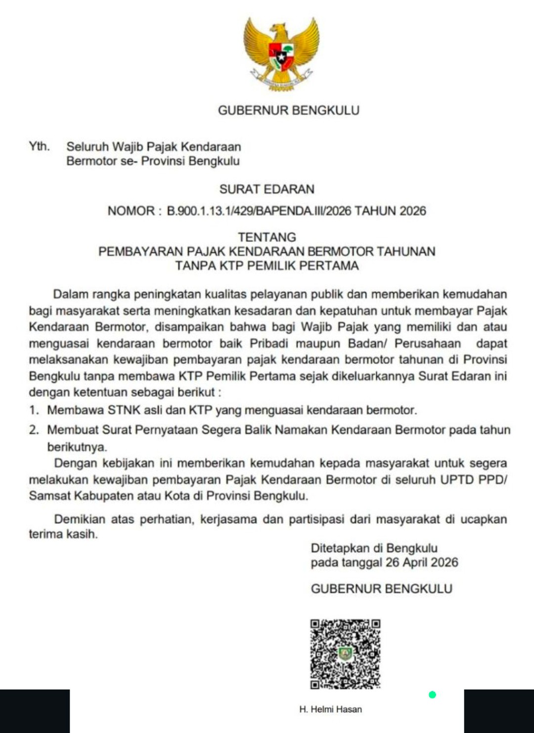 Surat edaran ini mulai berlaku sejak ditetapkan pada 26 April 2026 di Bengkulu, dan diharapkan mampu meningkatkan pendapatan daerah dari sektor pajak kendaraan bermotor sekaligus memperbaiki basis data kepemilikan kendaraan.